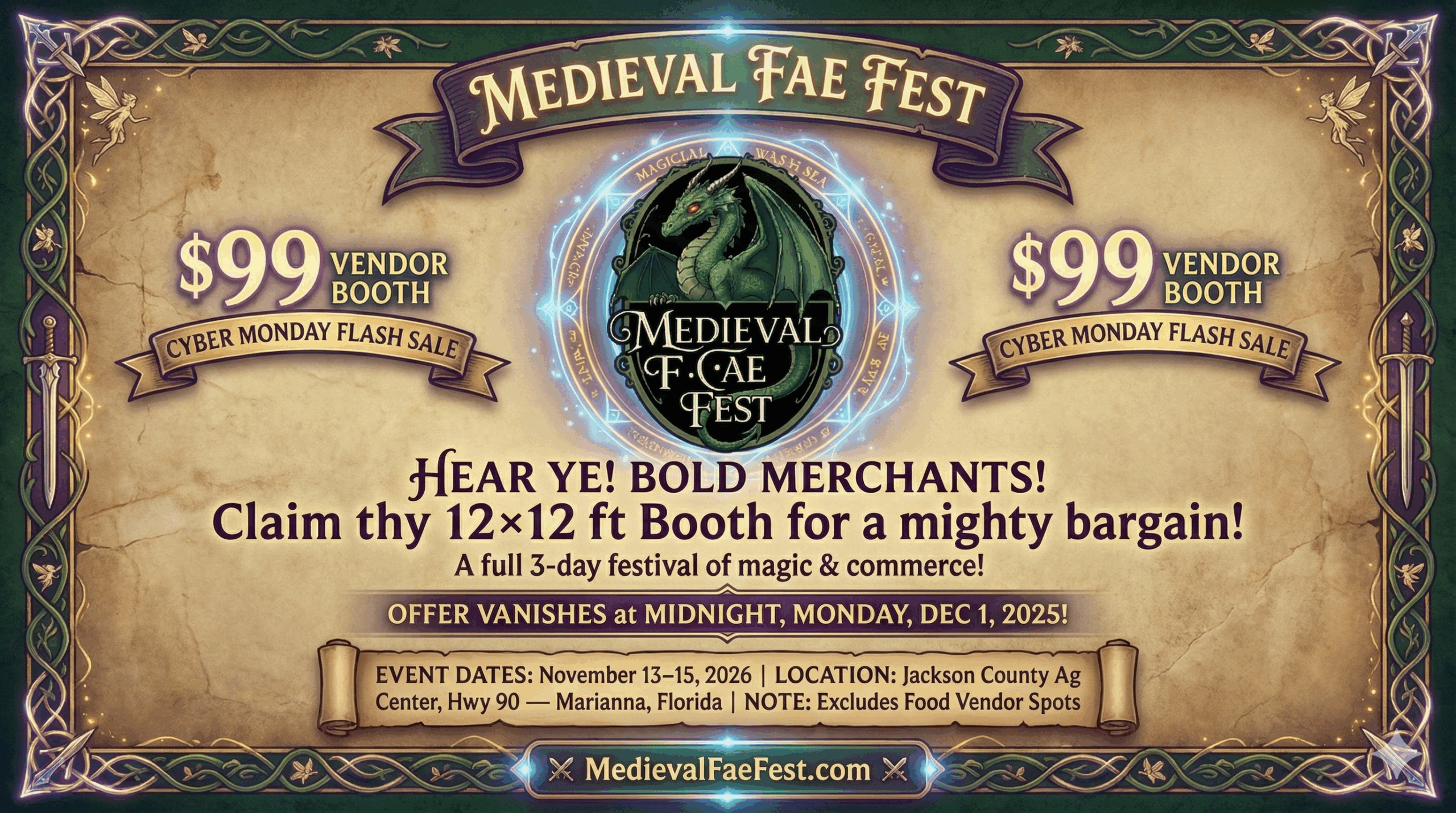 In the spirit of gallantry and grand adventure, Medieval Fae Fest declares a Cyber Monday Flash Sale fit for the bravest of vendors!